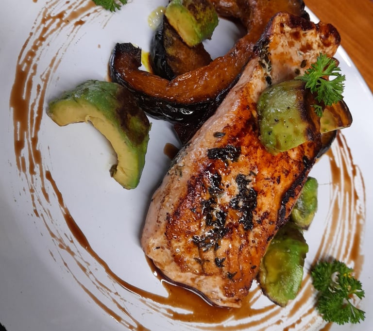 Miércoles: vegetales asados (berenjenas, tomates, pimientos) con filet de pescado.